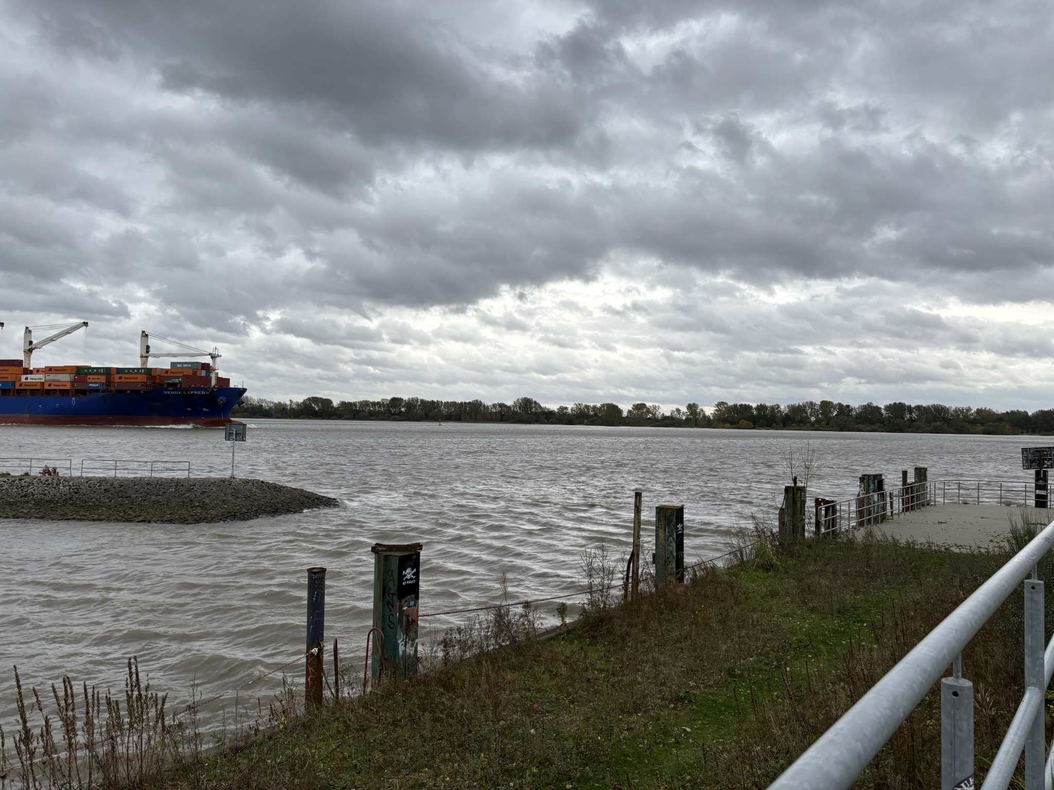 Herbststurm über der Elbe. Grauer Himmel, Wind aus West. Das Wasser drückt tief in die kleine Bucht am Rand des BusinessParks. Zwischen Graffiti an alten Spundwänden und neuen Sitzbänken steht die Mole, die Wellen rollen an die Steinschüttung. Still ist es nicht, aber der Ort wirkt heute zurückgenommen. Wer hier steht, schaut auf ein Stück Wedeler Geschichte.